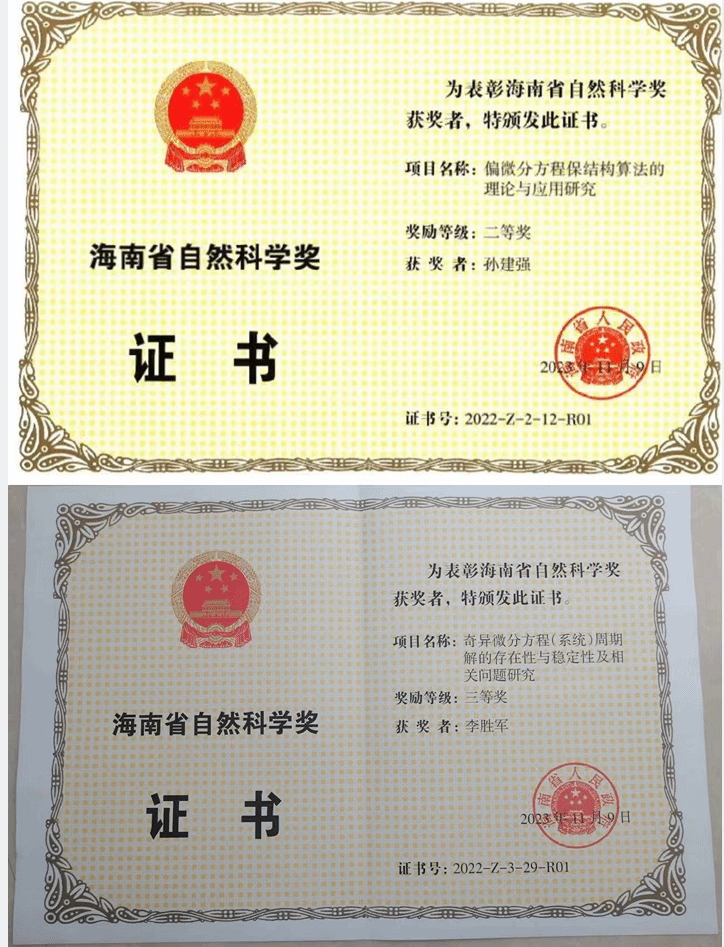 12月5日,海南省科学技术奖励大会在海口召开,省委书记、省人大常委会主任冯飞出席会议并讲话,省委副书记、省长刘小明主持,省委副书记沈丹阳等省领导出席会议。海南大学有20项科研成果获得了2022年度海南省科学技术奖。我院2项科研成果获得了2022年度海南省自然科学奖,取得了优异的成绩。我院孙建强教授主持申报的“偏微分方程保结构算法的理论与应用研究”获得了海南省自然科学奖二等奖,李胜军教授主持申报的“奇异微分方程(系统)周期解的存在性与稳定性及相关问题研究”获得了海南省自然科学奖三等奖。表明我院数学学科微分方程理论与数值方法的研究取得了重大进展。